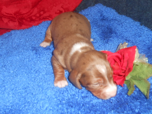 This beautiful little Chocolate and Tan, Dapple, Piebald, Short Haired boy was born on 11-9-21, and will be ready to take home on 1-4-22. He is AKC and CKC Registered, Health Guaranteed, with Full Breeding Rights, and is $1600. His Mother, Dolly, is a Short Haired Isabella and Tan, weighing about 9lbs., and Father, Charlie Brown, a Short Haired Chocolate and Tan Dapple, weighing about 9lbs. This sweet little boy will definitely grow into a very Handsome Dog.