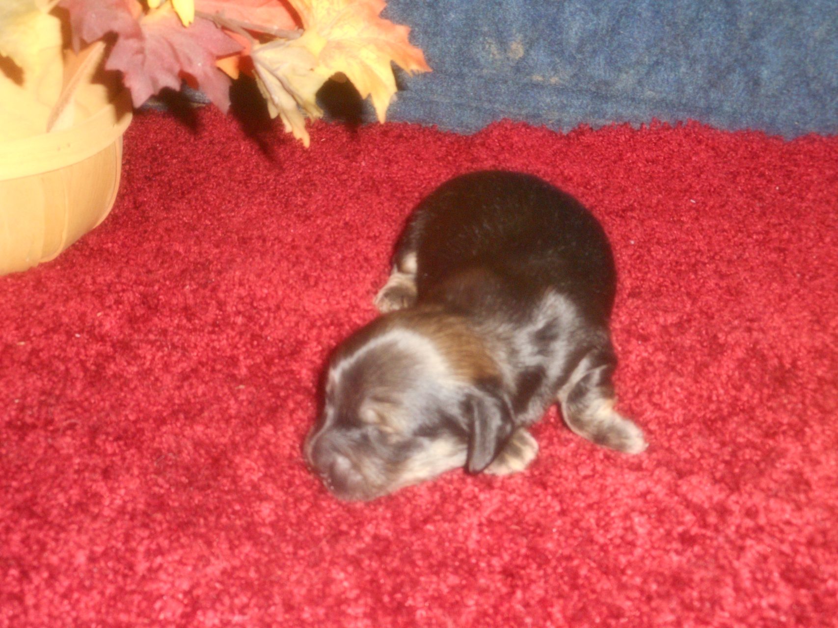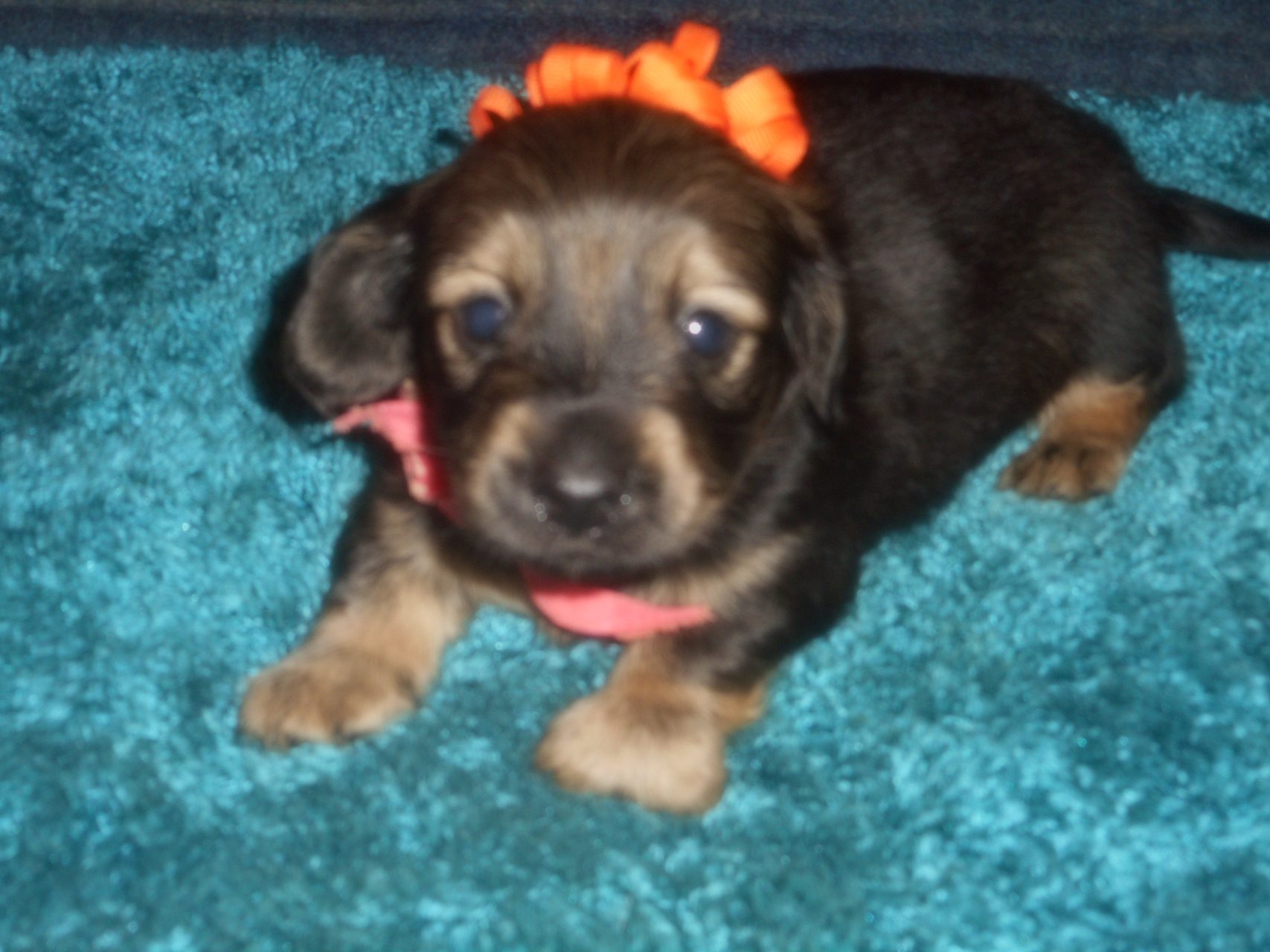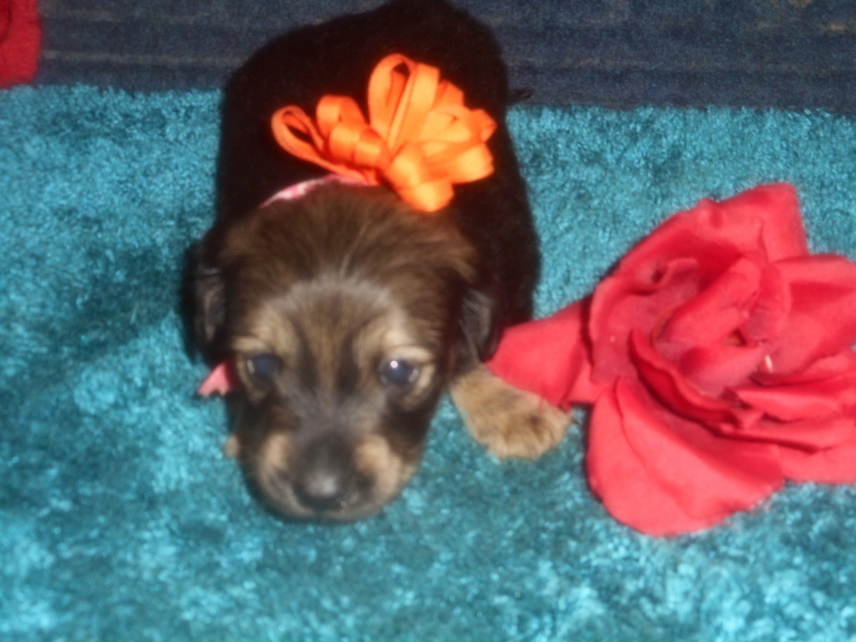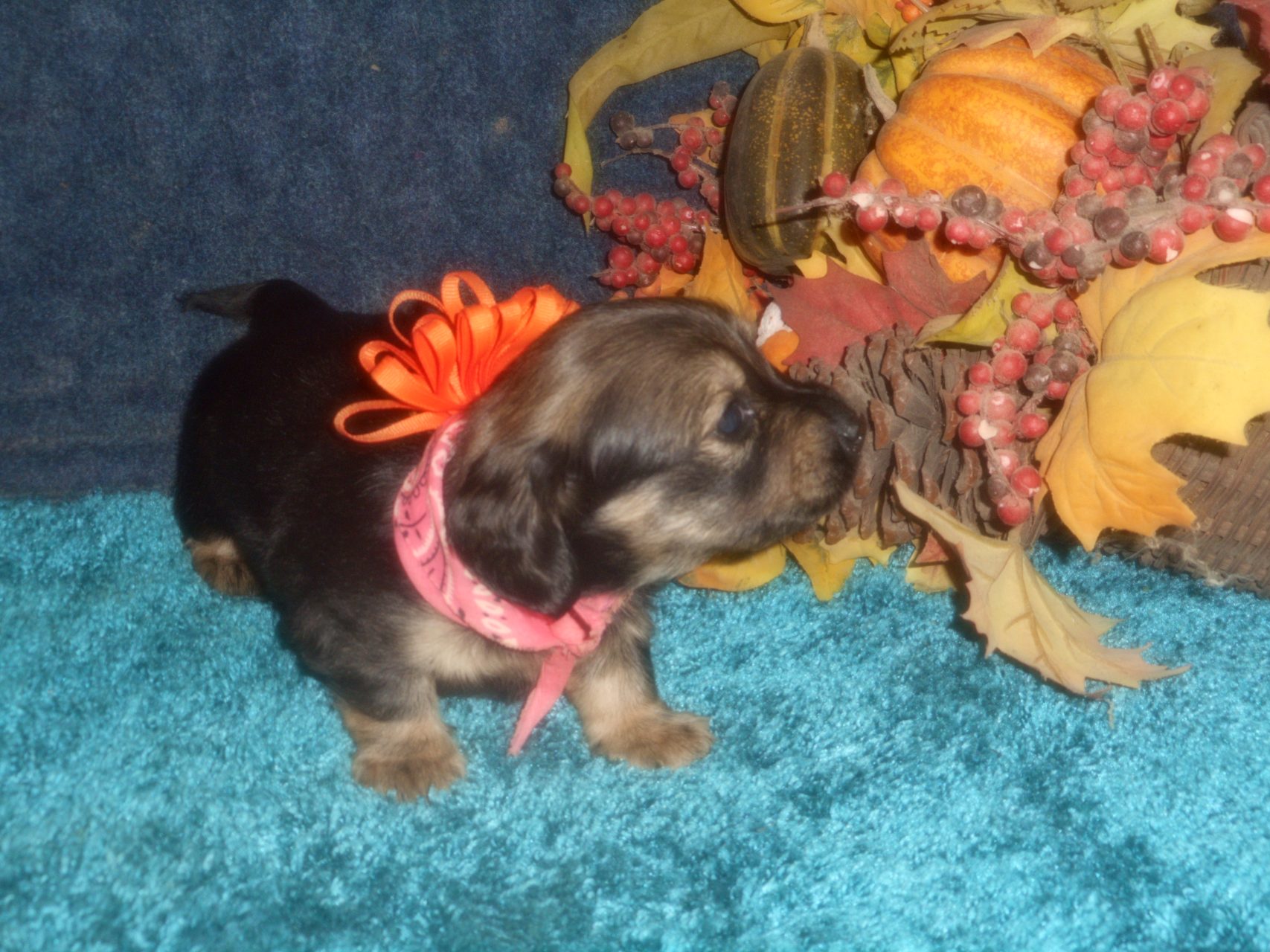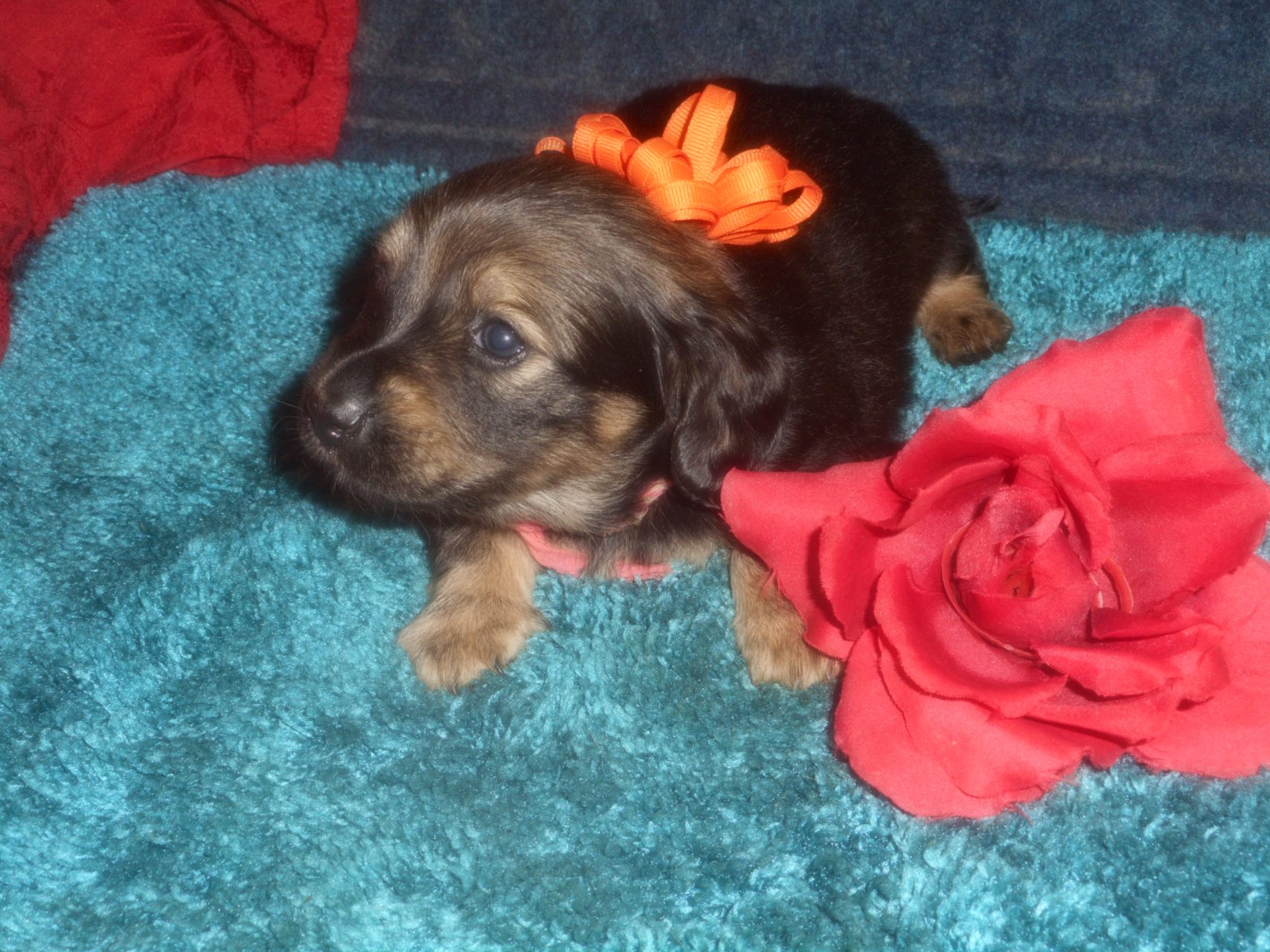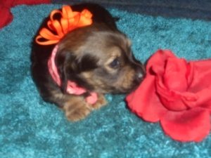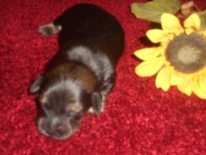 AKC and CKC Registered, Health Guarantee, with Full Breeding Rights, and is $1850. I also offer a One Year Health Guarantee if you continue her on the Nu-Vet Plus. You can order them right off my website. Her Mom, Lady, is a Longhair Shaded Red, weighing about 11lbs. Her Dad, Levi, is a Longhair Isabella and Cream, weighing about 11lbs. This precious baby has Chocolate in the Black and Cream, which makes her very unusual. This sweet baby will most definitely grow into a Gorgeous Dog.