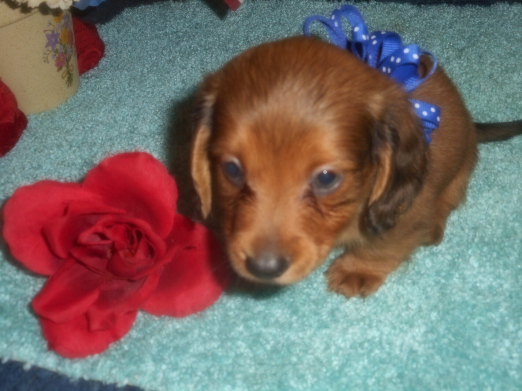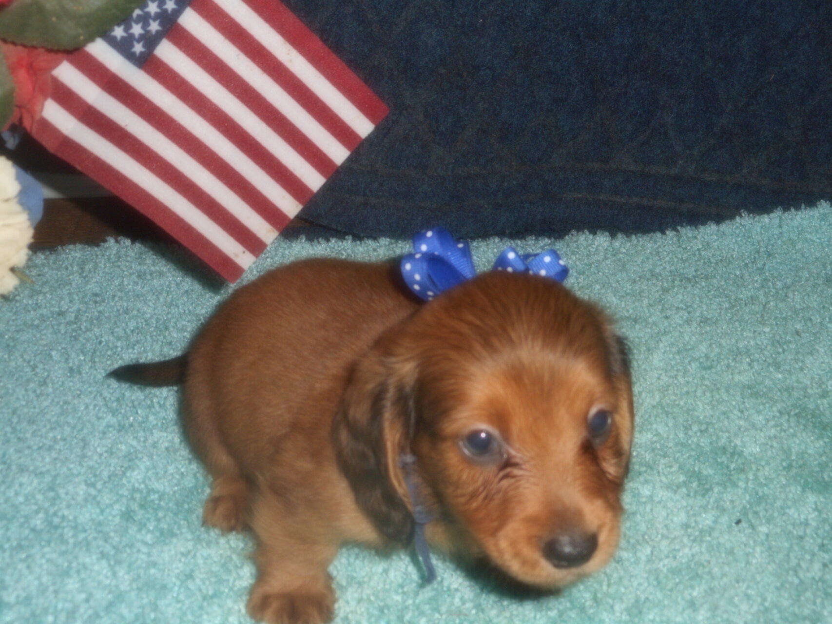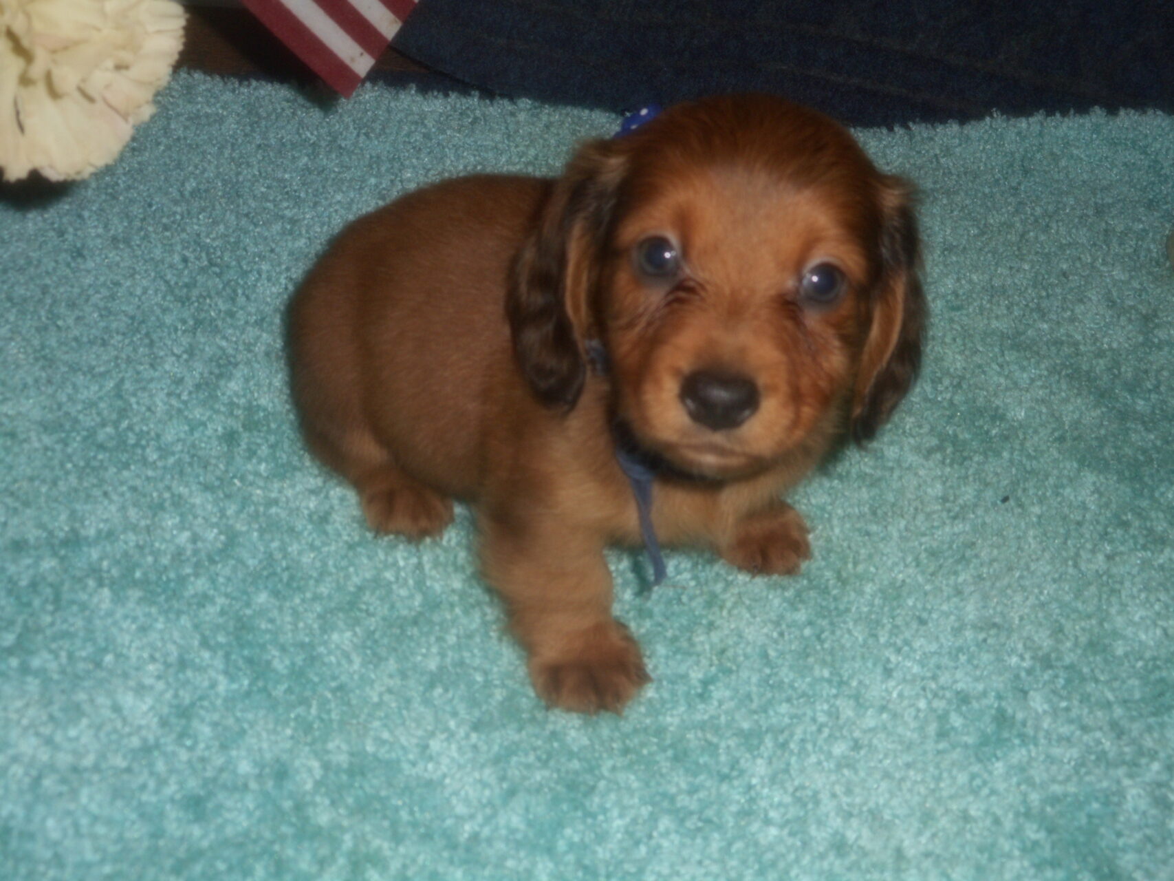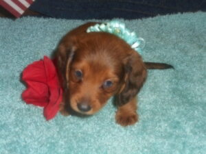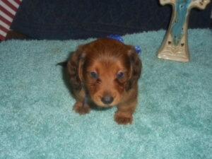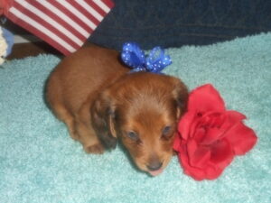 This precious little boy was born on 6-7-25 and can go to his forever home on 8-2-25.  He is AKC Registered, Health Guaranteed, with Full Breeding Rights, and is $1750.  I also offer a One Year Health Guarantee if you continue him on the Nu-Vet Plus Vitamins that he is already on, for the year.  His Mom, Mia, is a Short Hair Black and Tan weighing about 9 lbs.  His Dad, Samson, is a Longhair Cream Piebald weighing about 11 lbs.  This little boy will most definitely grow into a Gorgeous Dog.  This baby boy is very small and so sweet.