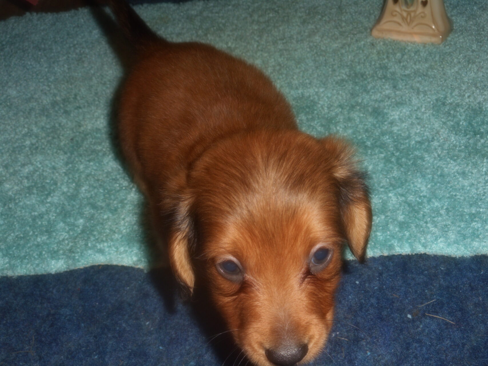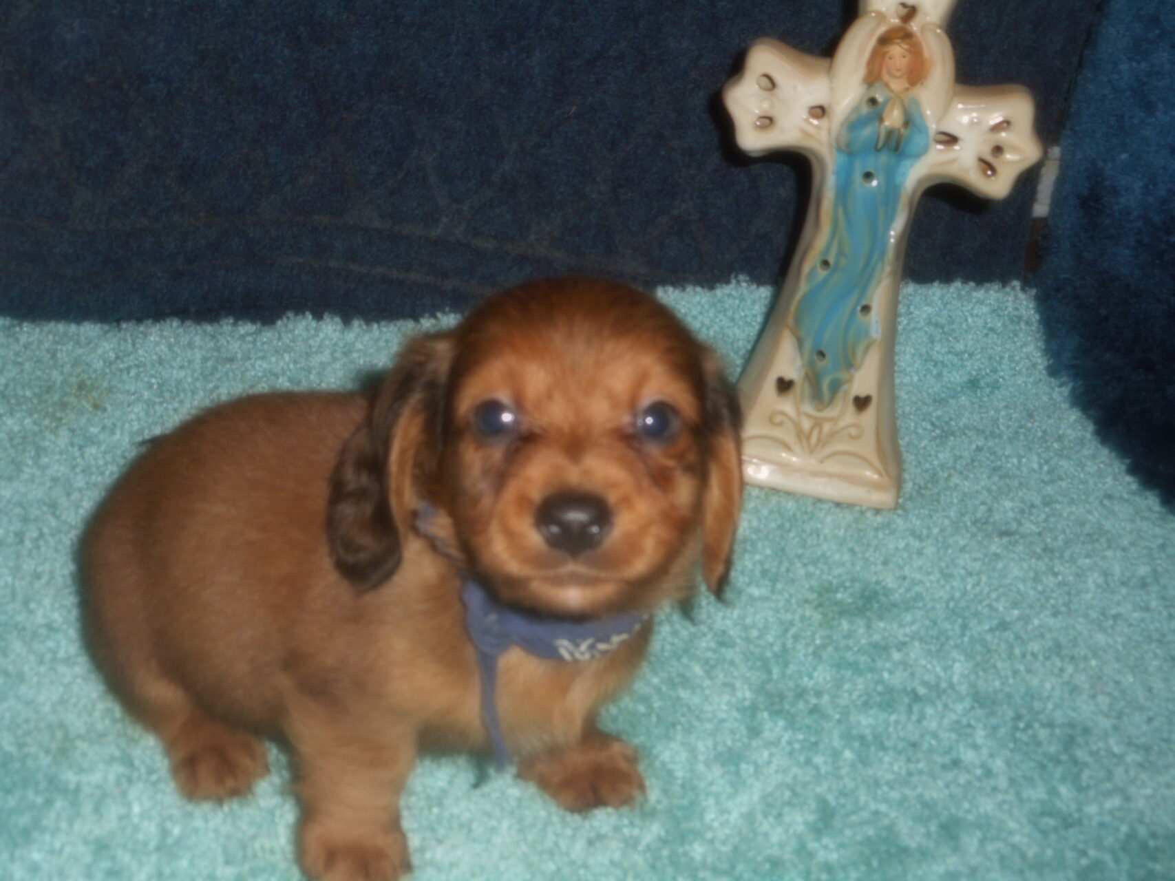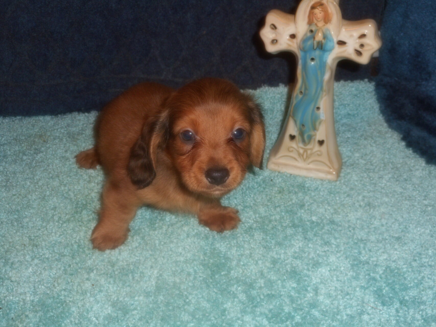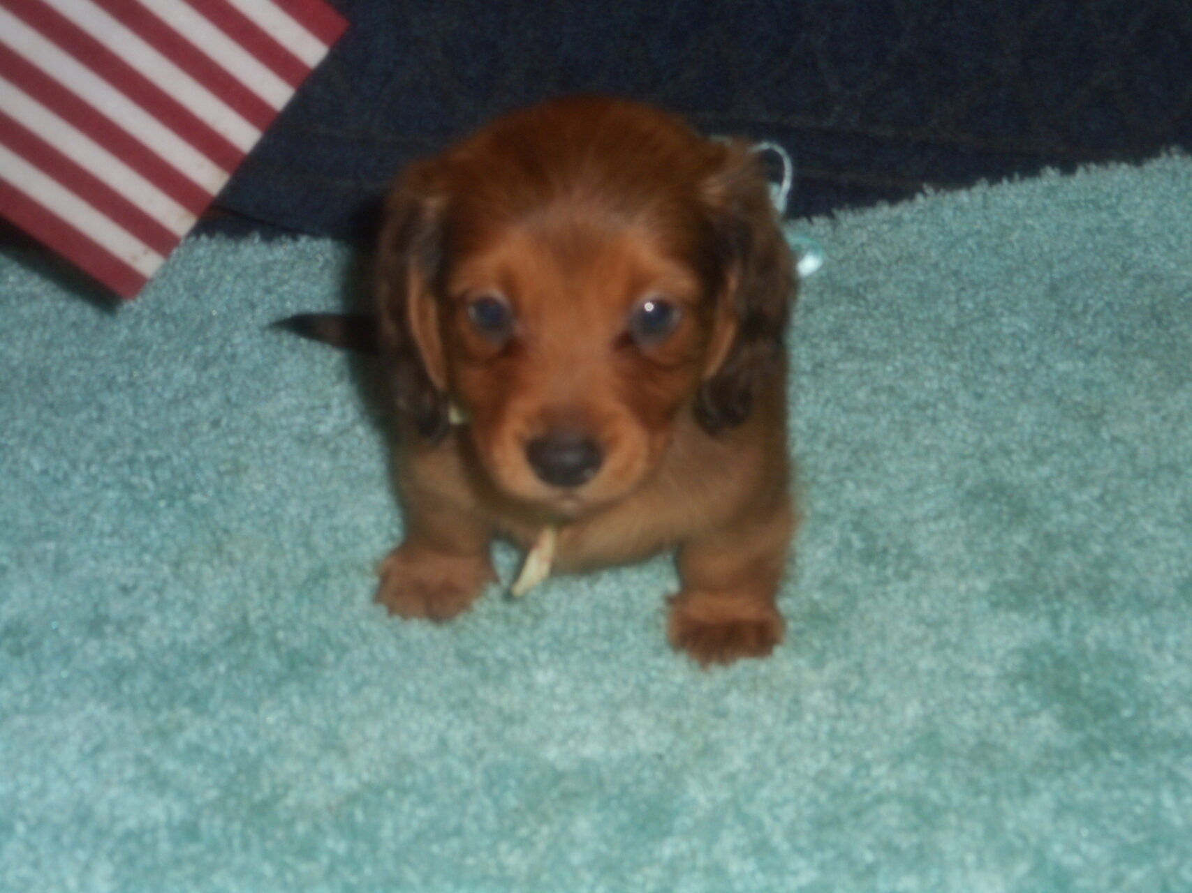 This precious little boy was born on 6-7-25 and can go to his forever home on 8-2-25.  He is AKC Registered, Health Guaranteed, with Full Breeding Rights, and is $1750.  I also offer a One Year Health Guarantee if you continue him on the Nu-Vet Plus Vitamins that he is already on, for the year.  His Mom, Mia, is a Short Hair Black and Tan weighing about 9 lbs.  His Dad, Samson, is a Longhair Cream Piebald weighing about 11 lbs.  This little boy will most definitely grow into a Gorgeous Dog.  This baby boy is very small and so sweet.