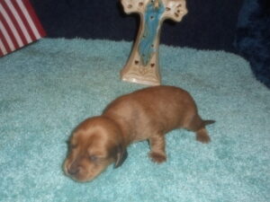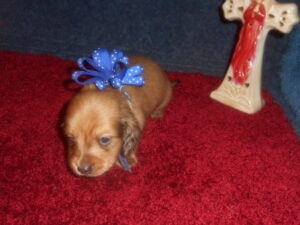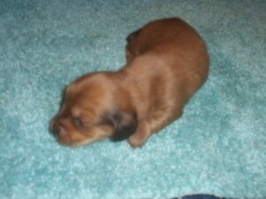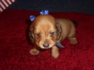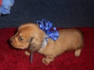 This precious little boy was born on 6-7-25 and can go to her new home on 8-2-25.  He is AKC Registered, Health Guaranteed, with Full Breeding Rights, and is $1800.  I also offer a One Year Health Guarantee if you continue him on the Nu-Vet Plus vitamins that he will already be on, for the year.  His Mom, Mia, is a Short Hair Black and Tan weighing about 9 lbs.  His Dad, Samson, is a Longhair Cream Piebald weighing about 11 lbs.  This little boy will most definitely grow into a Gorgeous Dog.