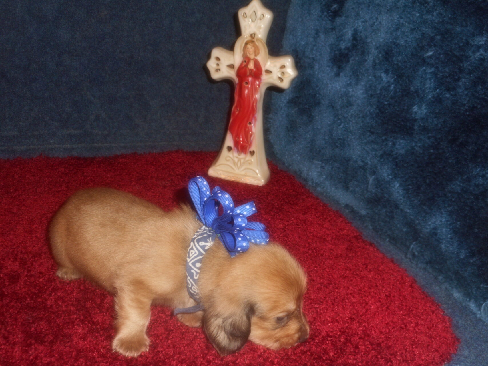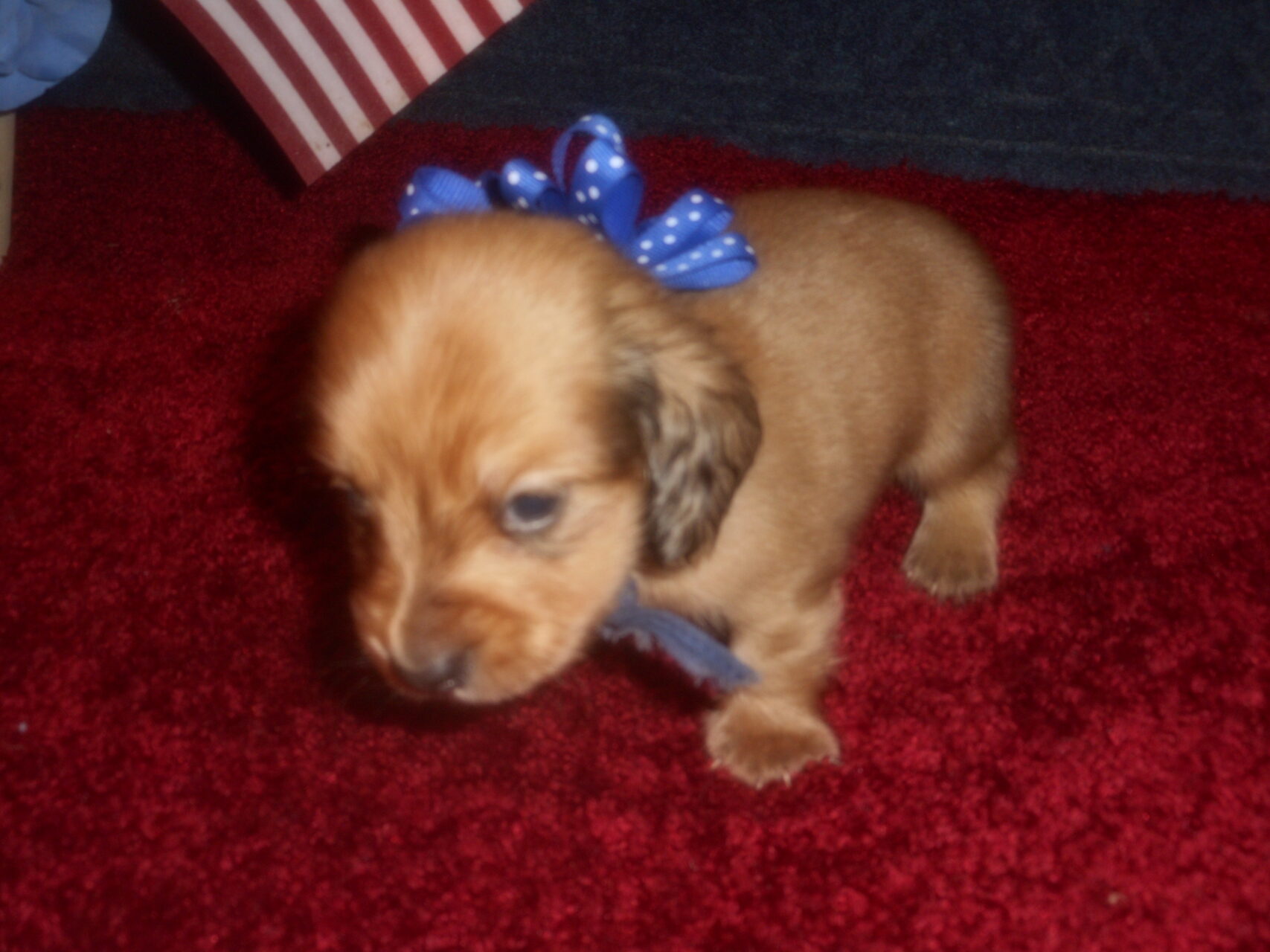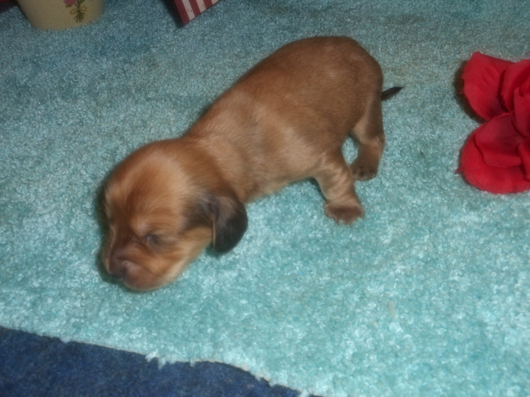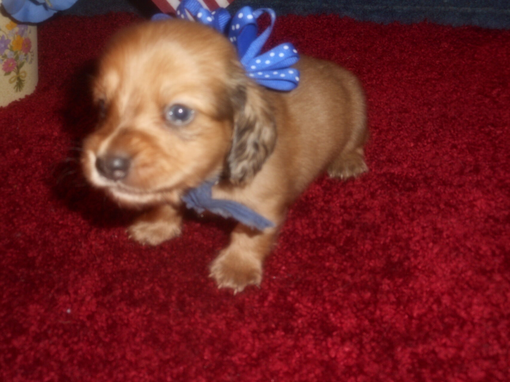 This precious little boy was born on 6-7-25 and can go to her new home on 8-2-25.  He is AKC Registered, Health Guaranteed, with Full Breeding Rights, and is $1800.  I also offer a One Year Health Guarantee if you continue him on the Nu-Vet Plus vitamins that he will already be on, for the year.  His Mom, Mia, is a Short Hair Black and Tan weighing about 9 lbs.  His Dad, Samson, is a Longhair Cream Piebald weighing about 11 lbs.  This little boy will most definitely grow into a Gorgeous Dog.