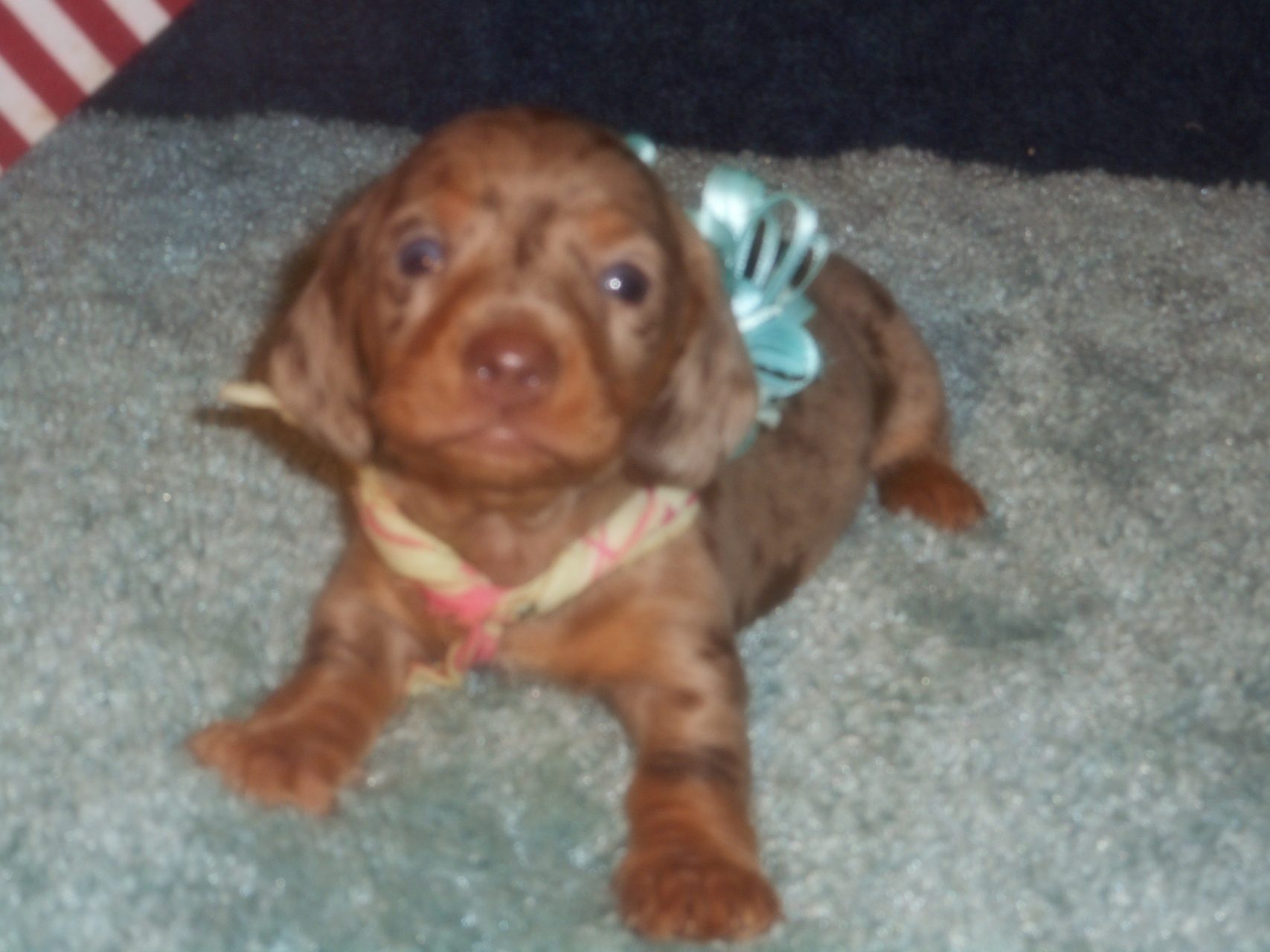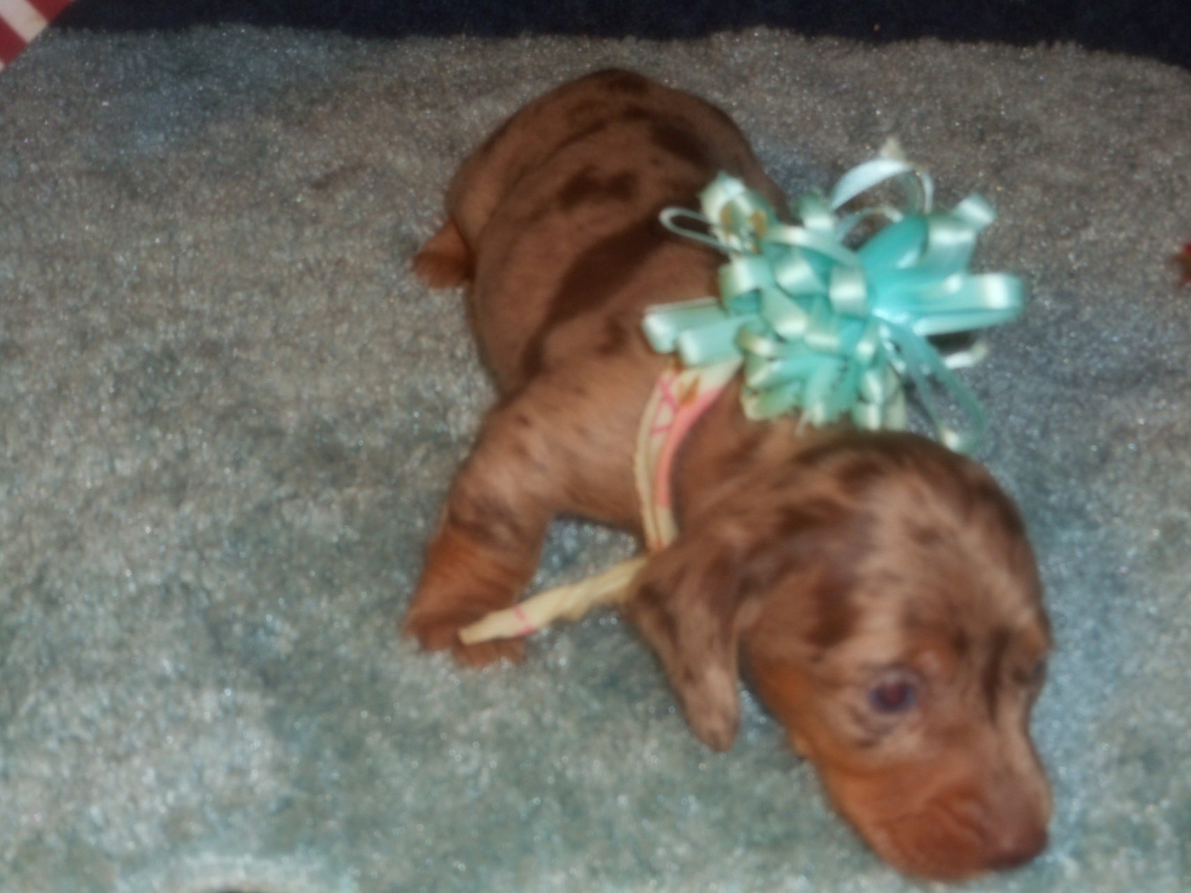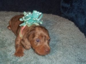 This beautiful little boy was born on 12-14-25 and can go home on 2-8-26. He is AKC and CKC Registered, Health Guaranteed, with Full Breeding Rights and is $2050. I also offer a One Year Health Guarantee if you continue him on the Nu-Vet Plus Vitamins he will be on when you pick him up. You can order them right off my website under Future Mothers. Also, be sure you put the code in. The Mom, Sugar, is a Short Hair Isabella and Tan Dapple, weighing about 11lbs. His Dad, Levi, is a Longhair Isabella and Cream, weighing about 11lbs. This precious baby boy will definitely grow into a Gorgeous Dog. He has a blue eye and a green eye. So pretty and handsome.
